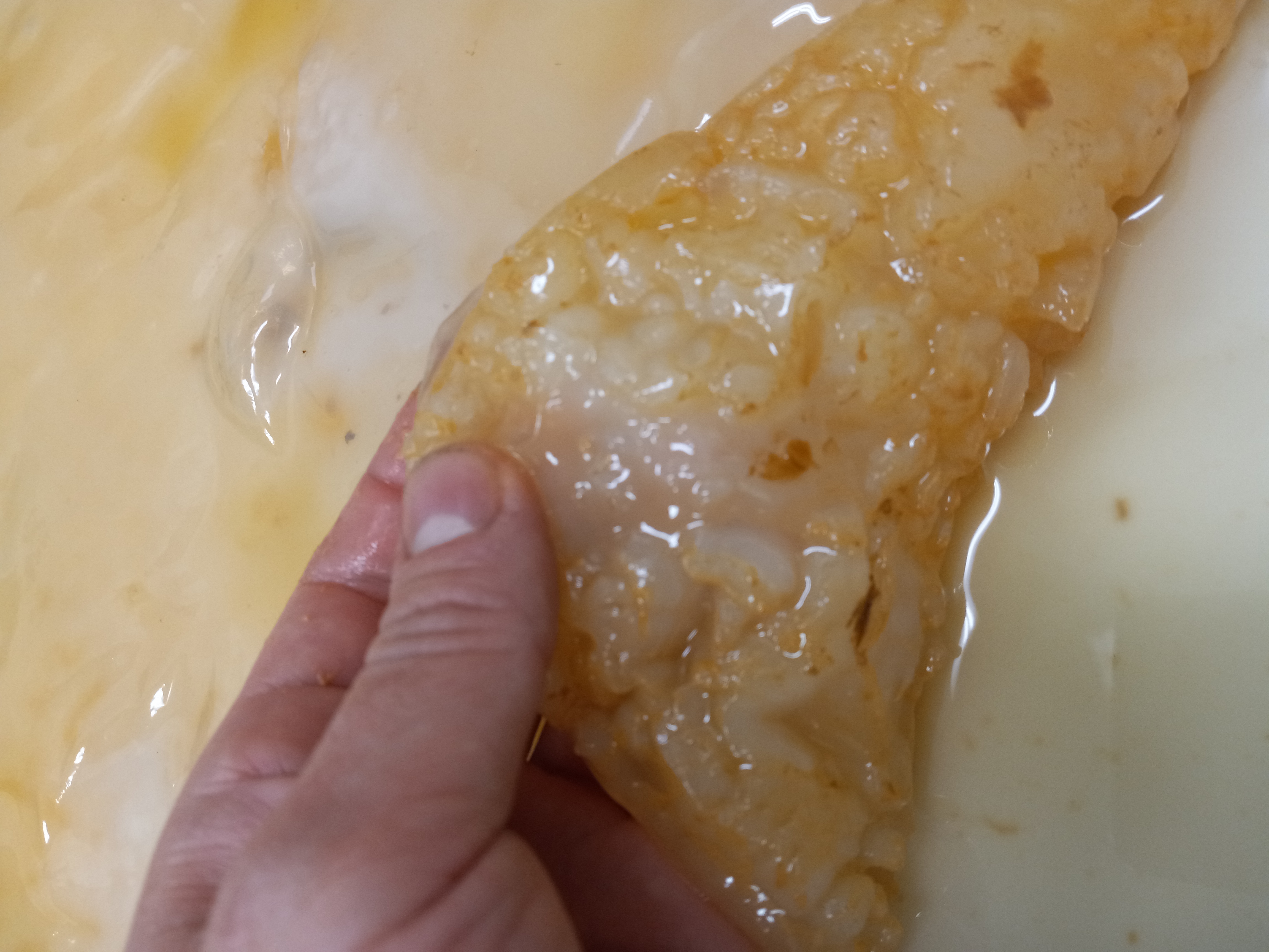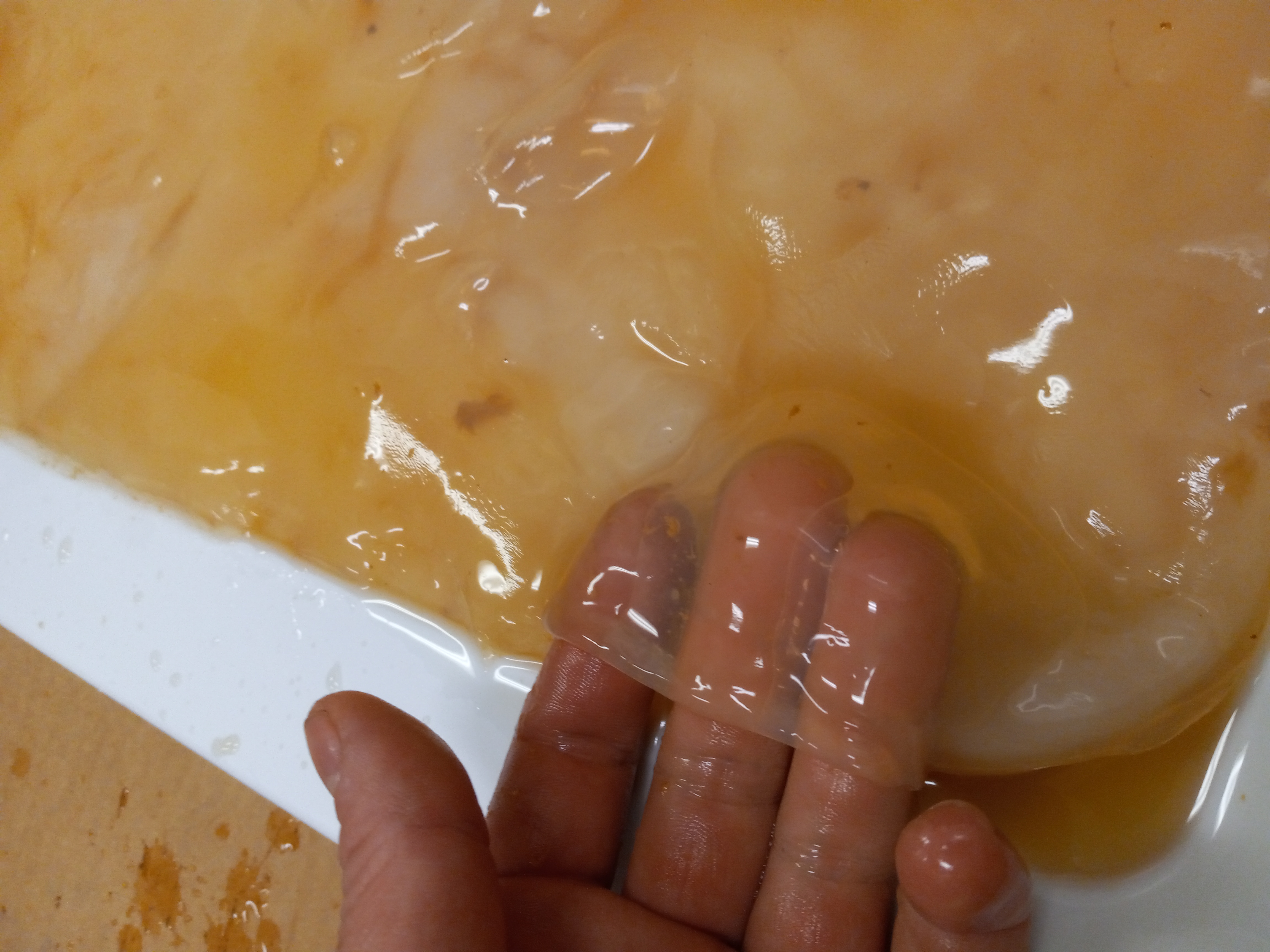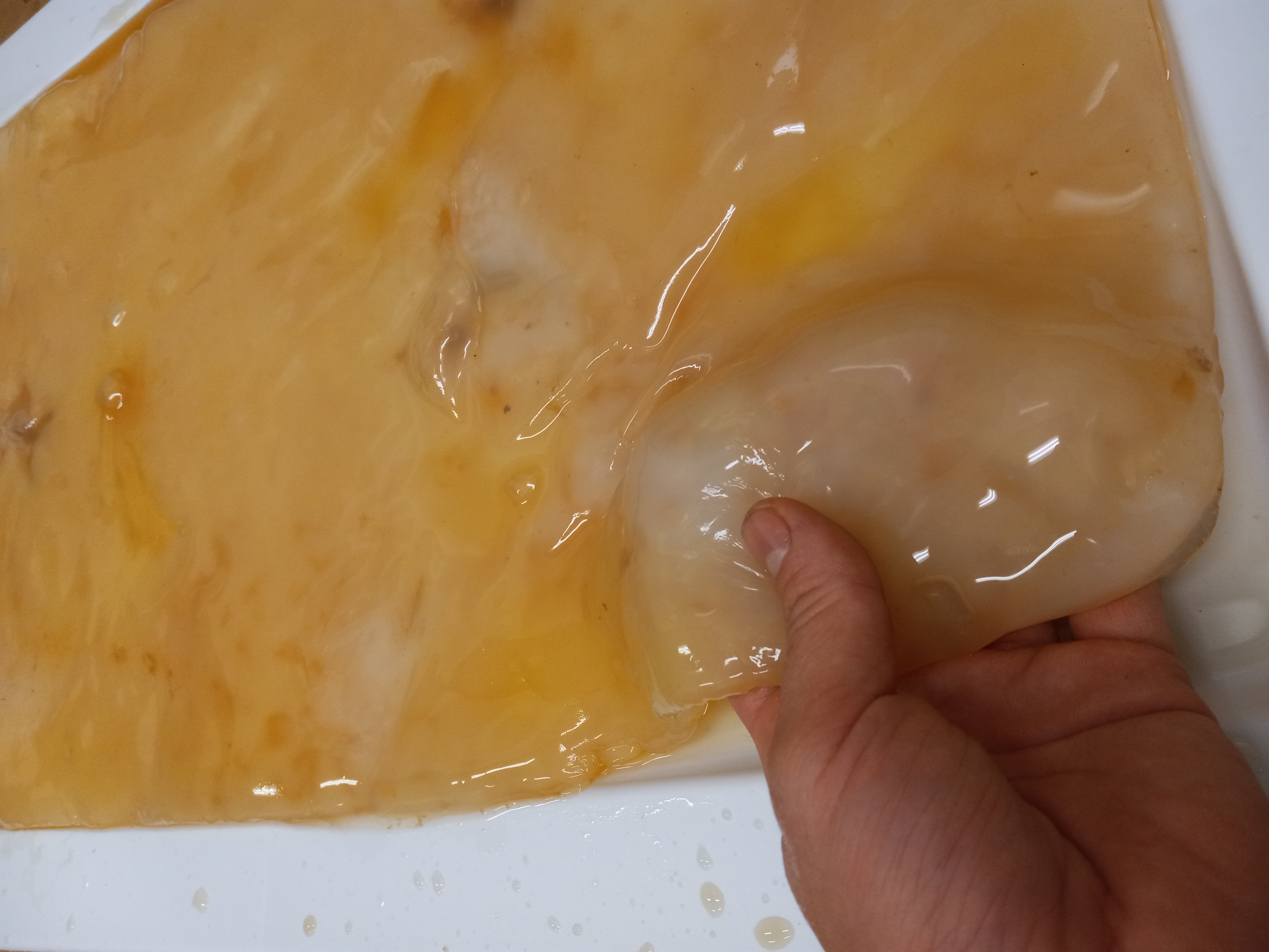Freshly harvest kombucha SCOBY. While quite thick now, it will lose most of this mass over the next week or two through evaporation.