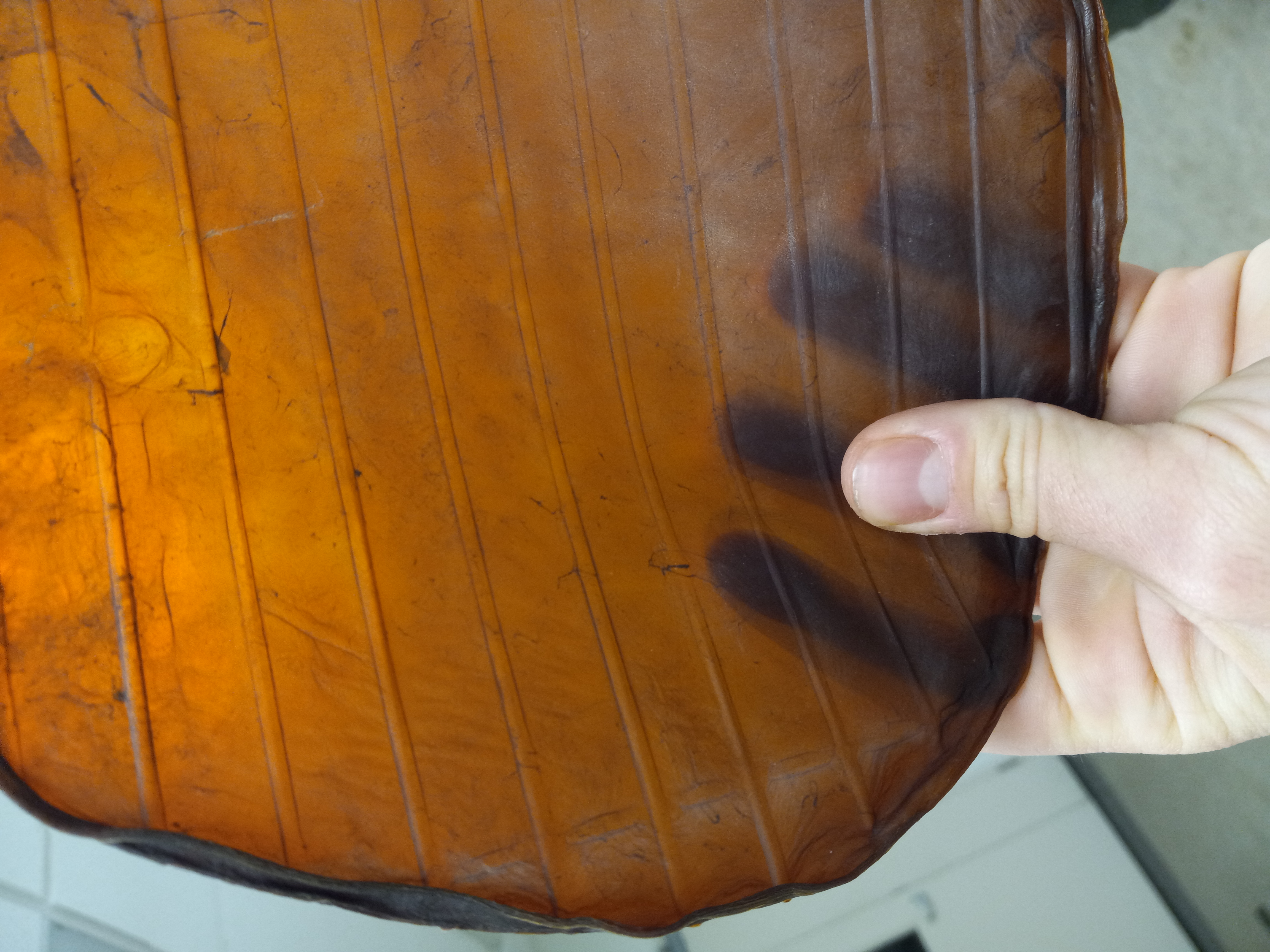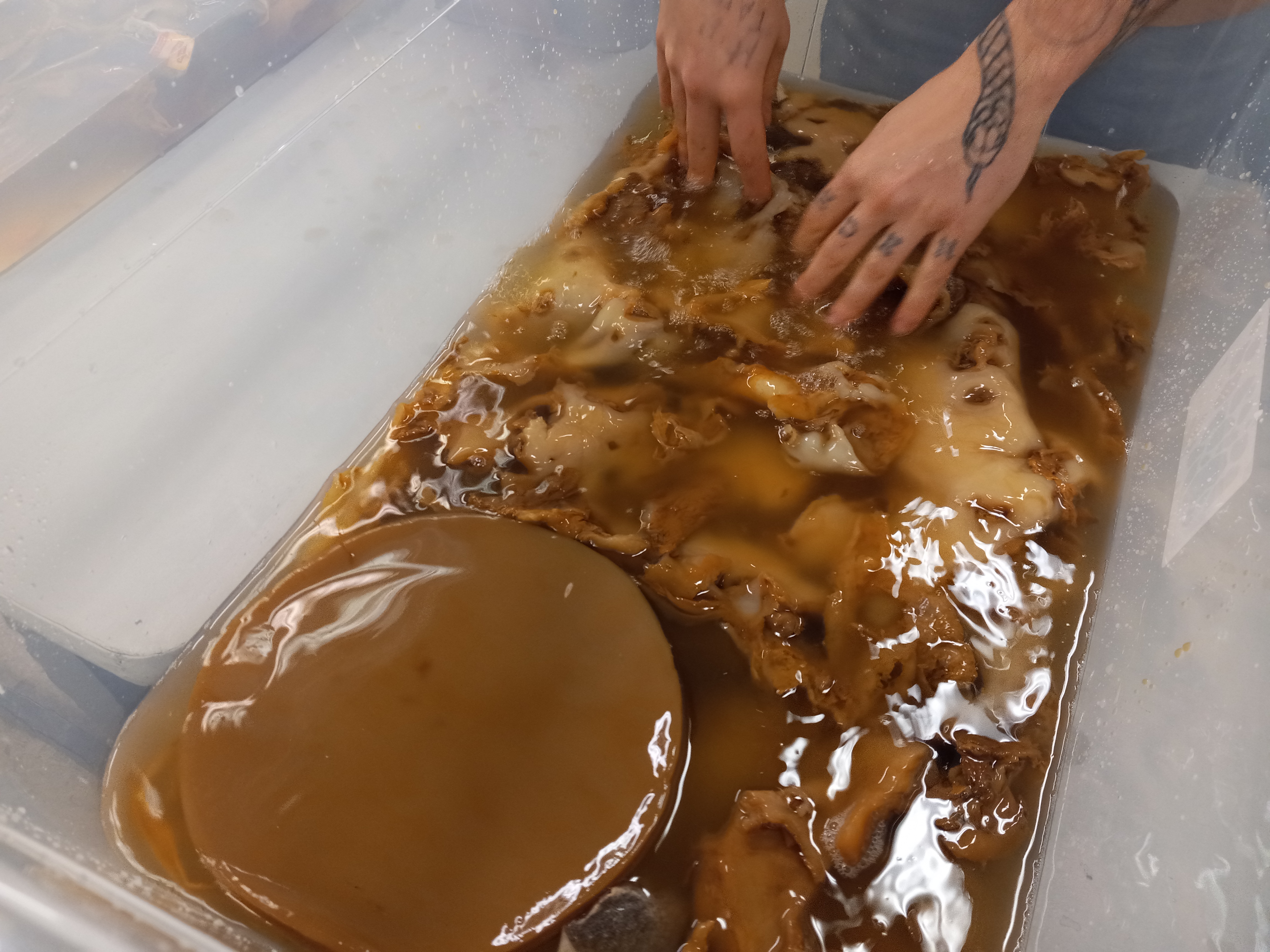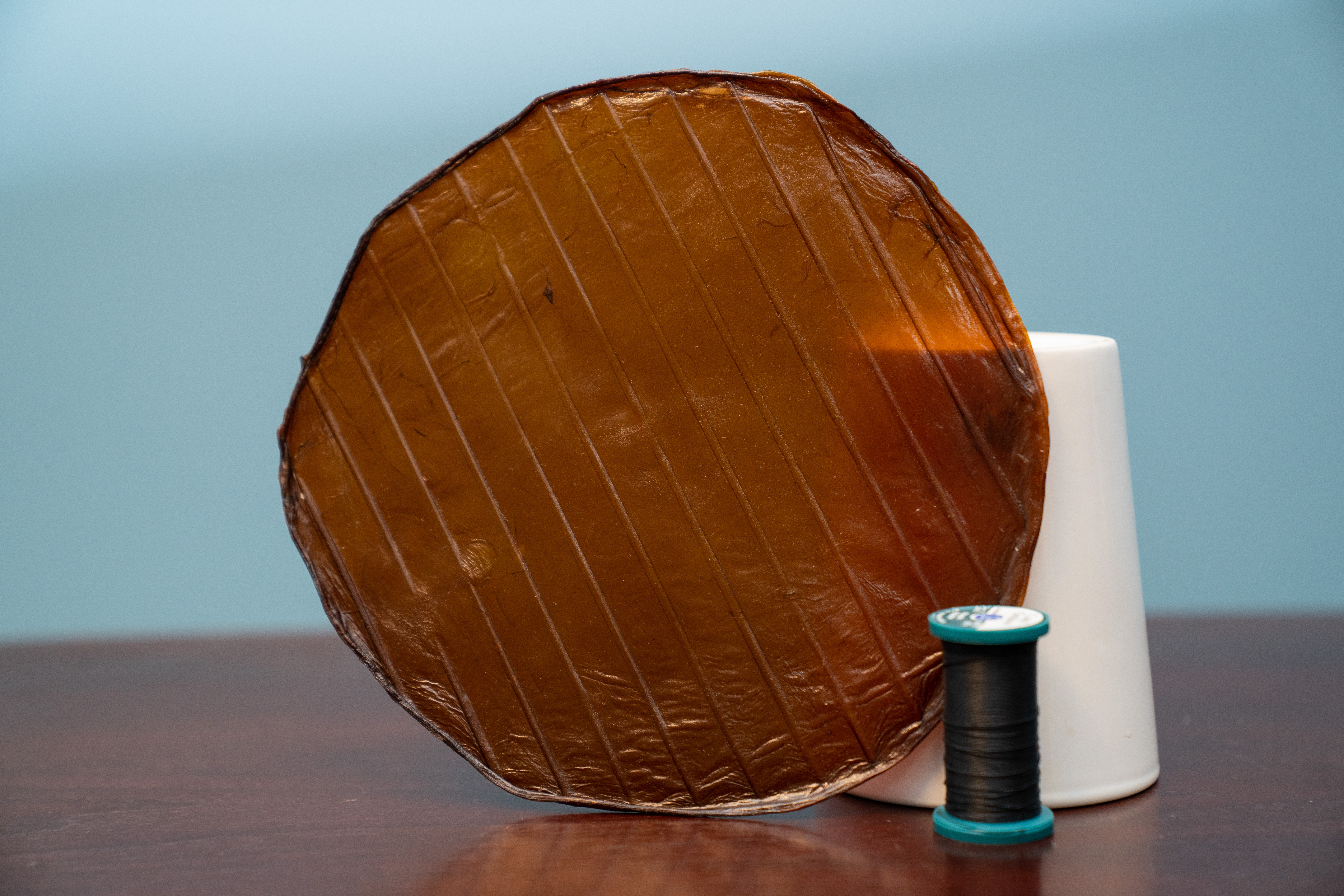 Freshly harvest kombucha SCOBY. While quite thick now, it will lose most of this mass over the next week or two through evaporation.